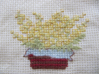 В этот раз предлагалось вышить замечательные весенние цветы - различные тюльпанчики , ярких цветов и оттенков , некоторые из которых только вылезли , а другие уже совсем расцвели . И конечно же , голландские акценты - мельница и желтый башмак . Когда-то знакомые привезли мне из Голландии пару желтых башмаков в виде брелка для ключей . Это самый распространенный сувенир . А вот теперь мне довелось их еще и вышить .